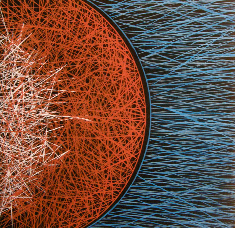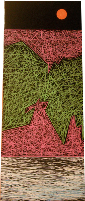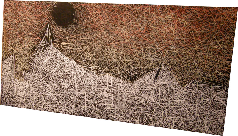 08年9月「山や風や雲と共に流れる星や人が空の穴である月へと闊歩するようなエネルギー」「その周囲や内部を素早く通過する鋭いもの」この2つをテーマにした、自身初となる個展、【 exhibition “ #100 ” 】 を京都【 GALLERY maronie 】 にて開催。これにより一つ大きな目標を設定した中で、ライブだけでない作品制作に没頭することによって、木を自由に削り、釘を打ち込んでキャンバスを作る物造りの楽しさを肌で一から感じ、絵を描く喜びを更に知る。