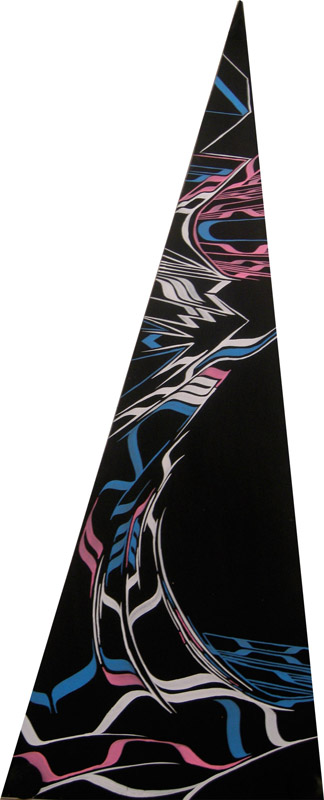 08年9月「山や風や雲と共に流れる星や人が空の穴である月へと闊歩するようなエネルギー」「その周囲や内部を素早く通過する鋭いもの」この2つをテーマにした、自身初となる個展、【 exhibition “ #100 ” 】 を京都【 GALLERY maronie 】 にて開催。これにより一つ大きな目標を設定した中で、ライブだけでない作品制作に没頭することによって、木を自由に削り、釘を打ち込んでキャンバスを作る物造りの楽しさを肌で一から感じ、絵を描く喜びを更に知る。