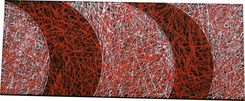 08年9月「山や風や雲と共に流れる星や人が空の穴である月へと闊歩するようなエネルギー」「その周囲や内部を素早く通過する鋭いもの」この2つをテーマにした、自身初となる個展、【 exhibition “ #100 ” 】 を京都【 GALLERY maronie 】 にて開催。これにより一つ大きな目標を設定した中で、ライブだけでない作品制作に没頭することによって、木を自由に削り、釘を打ち込んでキャンバスを作る物造りの楽しさを肌で一から感じ、絵を描く喜びを更に知る。