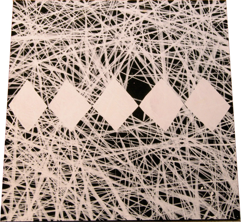 08年9月「山や風や雲と共に流れる星や人が空の穴である月へと闊歩するようなエネルギー」「その周囲や内部を素早く通過する鋭いもの」この2つをテーマにした、自身初となる個展、【 exhibition “ #100 ” 】 を京都【 GALLERY maronie 】 にて開催。これにより一つ大きな目標を設定した中で、ライブだけでない作品制作に没頭することによって、木を自由に削り、釘を打ち込んでキャンバスを作る物造りの楽しさを肌で一から感じ、絵を描く喜びを更に知る。